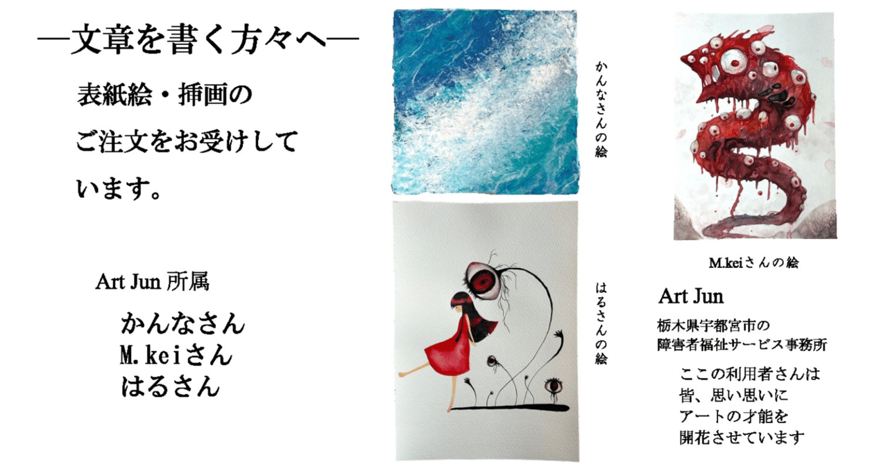 はじめに 小説、詩、エッセイ、短歌……もの書きは、自分の作品に合った「絵」を欲しいと思いますよね。表紙や挿画、口絵……。 今回、「つなぐ、結ぶ、創る ミモザとビオラ」は、もの書きと絵師さまのマッチングの企画として、栃木県宇都宮市にある障害者...